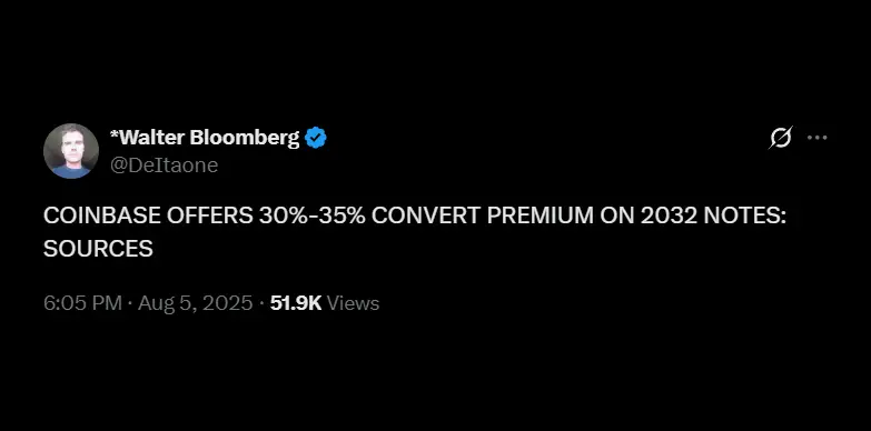 X User Walter Bloomberg highlights that Coinbase will offer 30-35% premium on convertible notes offerings